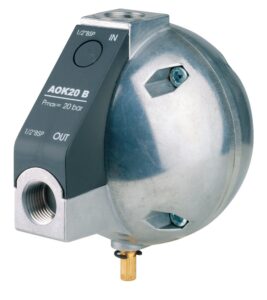 AOK20B-został zaprojektowany do w pełni automatycznego zrzucania kondensatu lub innych, nieagresywnych cieczy z systemu sprężonego powietrza. To urządzenie może być zainstalowane jako zewnętrzny drenaż przy którejkolwiek z poniższych aplikacji. Kondensat zbiera się w aluminiowym zbiorniku a gdy jego poziom jest odpowiednio wysoki, zostaje odprowadzony z układu bez jakichkolwiek strat powietrza. Bezpośrednio działający zawór kulowy jest połączony z pływakiem co zapewnia wydajną i niezawodną pracę. Dzięki solidnej aluminiowej obudowie, AOK20B nadaje się do pracy w najtrudniejszych warunkach. AOK20B nie wymaga zasilani, i może być montowany pod filtrami, separatorami cyklonowymi innych producentów. Sprawdza się jako odwodnienie instalacji sprężonego powietrza. W kwestii zastosowań niewyszczególnionych na liście, należy skontaktować się ze sprzedającym.